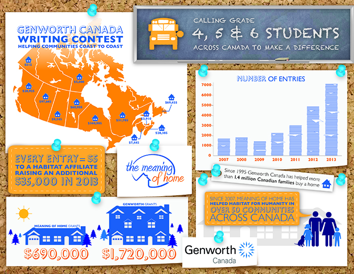 TORONTO, Oct. 1, 2014 /CNW/ - Starting today, students in grades 4, 5 and 6 across Canada are invited to submit an essay about what home means to them for a chance to win great prizes and help fund the construction of a Habitat for Humanity home in Canada. Genworth Canada's Meaning of Home Contest, now in its eighth year, has directed nearly $700,000 to Habitat for Humanity homebuilding nationwide.